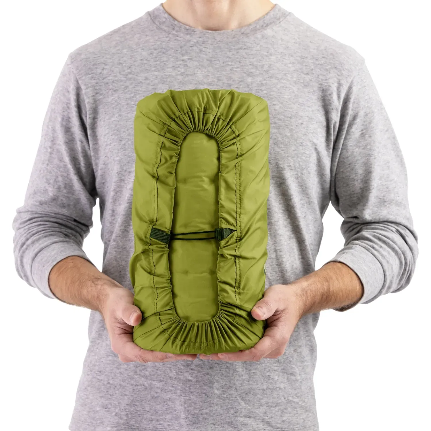 Форма Contour збільшує площу для сну приблизно на 12%, що робить килимок зручним для різних положень під час відпочинку. Міцний матеріал із сертифікованого переробленого поліестеру 75D забезпечує довговічність, а клапан дозволяє швидко надувати килимок і компактно згортати його для транспортування.