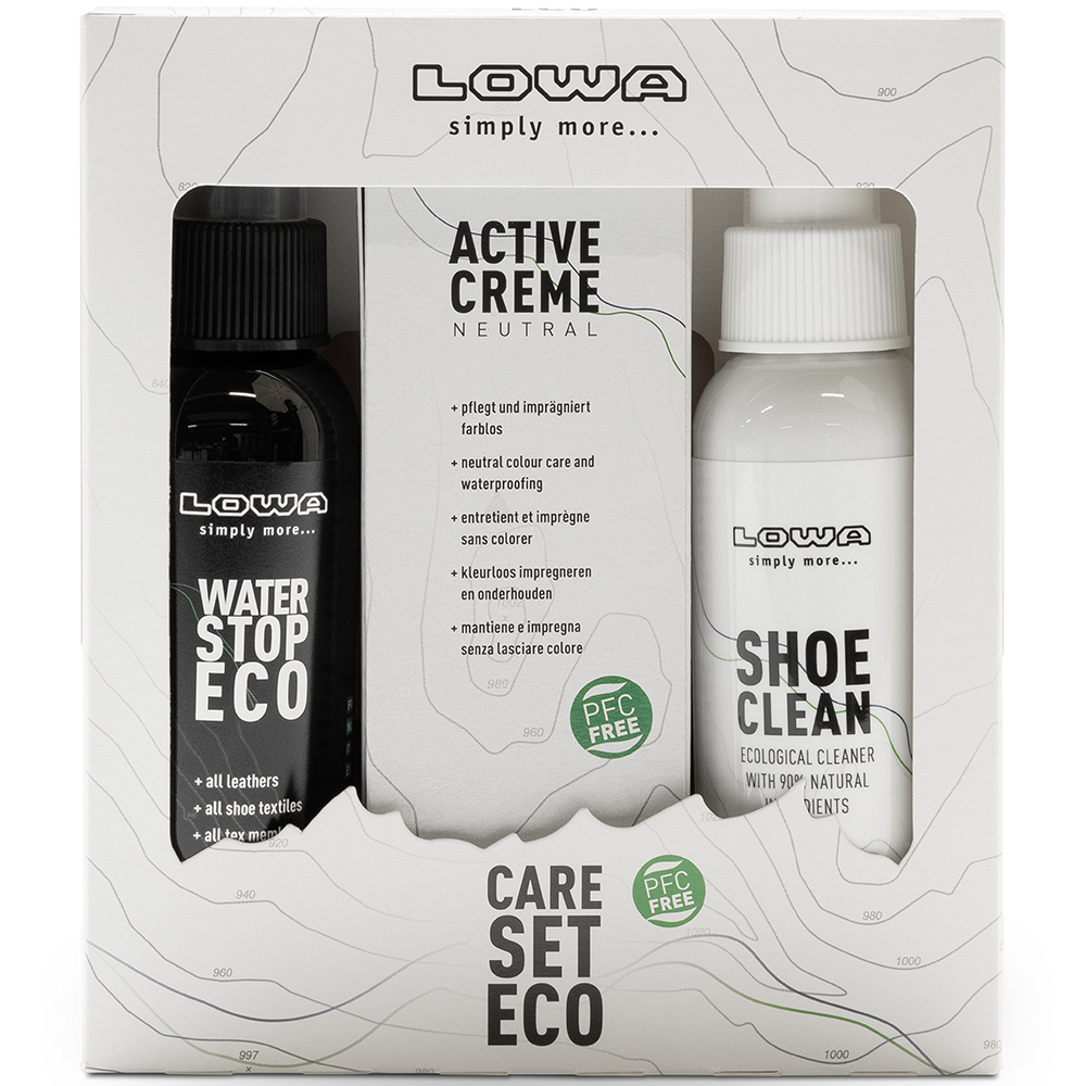 LOWA Care Set ECO – набір для догляду за взуттям. Складається з водовідштовхувального спрею Water Stop ECO 100 мл, крему Active Cream neutral 75 мл і спрею для очищення взуття Shoe Clean 100 мл. Призначений для всіх видів шкіри та комбінованих текстильних матеріалів, підходить для Gore-Tex та інших типів мембран.