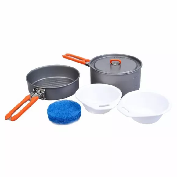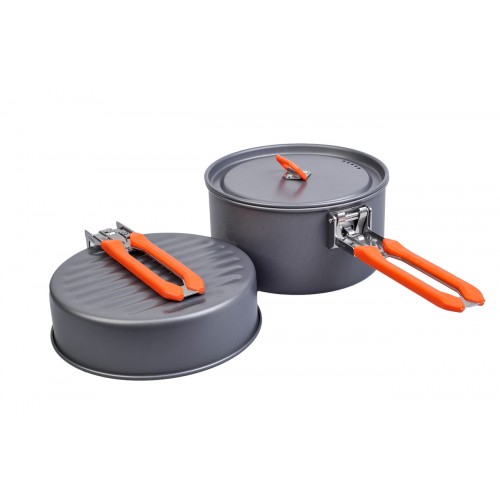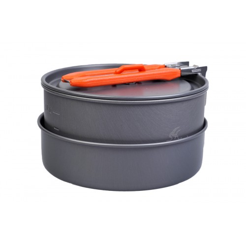Набір портативного посуду з анодованого алюмінію FEAST 1 – розрахований на 1-2 чоловік. Притому, що набір дуже компактний і легкий, вирішена головна задача – це зручність в експлуатації. Нова повноцінна ручка з фіксатором дозволяє зручно тримати посуд при готуванні, а при натисканні кнопки фіксатора дозволяє скласти ручку і зібрати набір в компактний вид для економії простору для зберігання і транспортування. Ручка виконана з приємного на дотик теплоізоляційного матеріалу. Стійке ззовнішнє покриття легко миється і не боїться відкритого ввогню. Не окислюється навіть при тривалій експлуатації. Упакована в сітчастий мішечок.