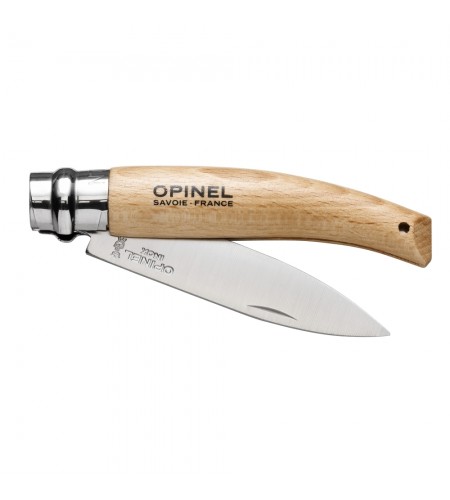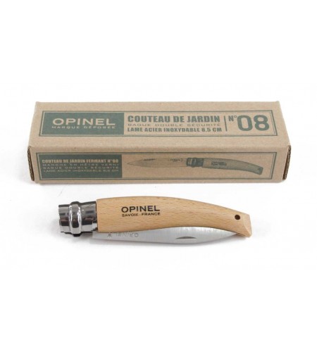 Opinel 8 VRI Couteau de Jardin – ніж створений спеціально для господарських робіт в саду і городі, з більш міцною конструкцією і широким лезом. Його клинок виконаний з нержавіючої сталі Sandvik, зі збільшеною добавкою вуглецю, що робить його твердіше, ніж звичайні ножі Opinel. Руків’я виготовлене з натуральної деревини бука. Її форма дуже зручно утримується в руці за рахунок розширення по середині і загнутого хвостовика. Для фіксації клинка, як у відкритому, так і закритому положенні використовується традиційний замок опинель – Virobloc. Ніж чудово працює як з продуктами на кухні, так і з невеликими гілками і бур’янами на дачі. Легкий, зручний і дуже гострий, він буде незамінний завжди і всюди.