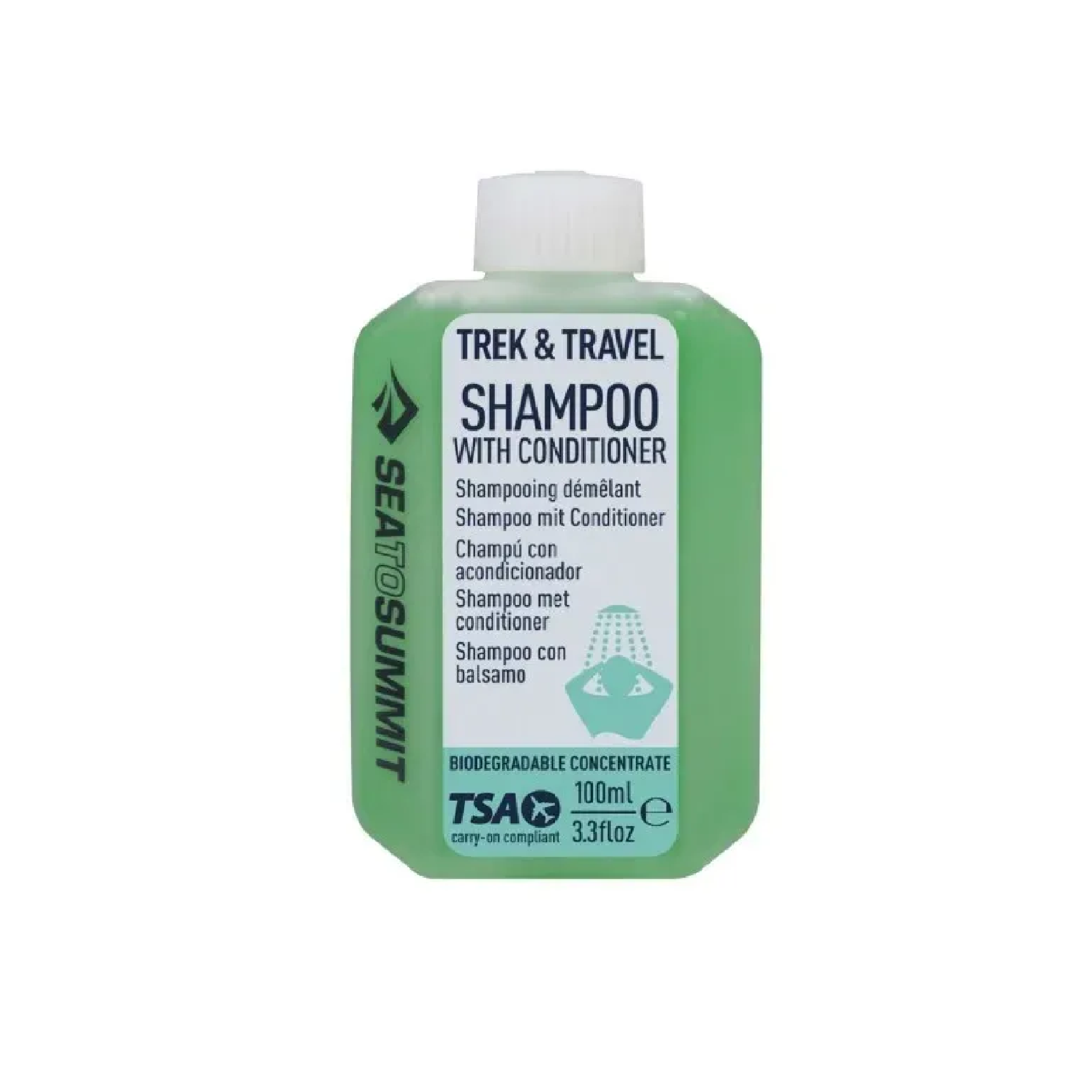 Шампунь Trek & Travel, який легко поміщається в ручну поклажу або туристичний рюкзак. Його можна використовувати як для волосся і тіла, так і для одягу. Герметична пляшка, призначена для подорожей, відповідає вимогам TSA, а її біорозкладна формула є екологічно чистою.